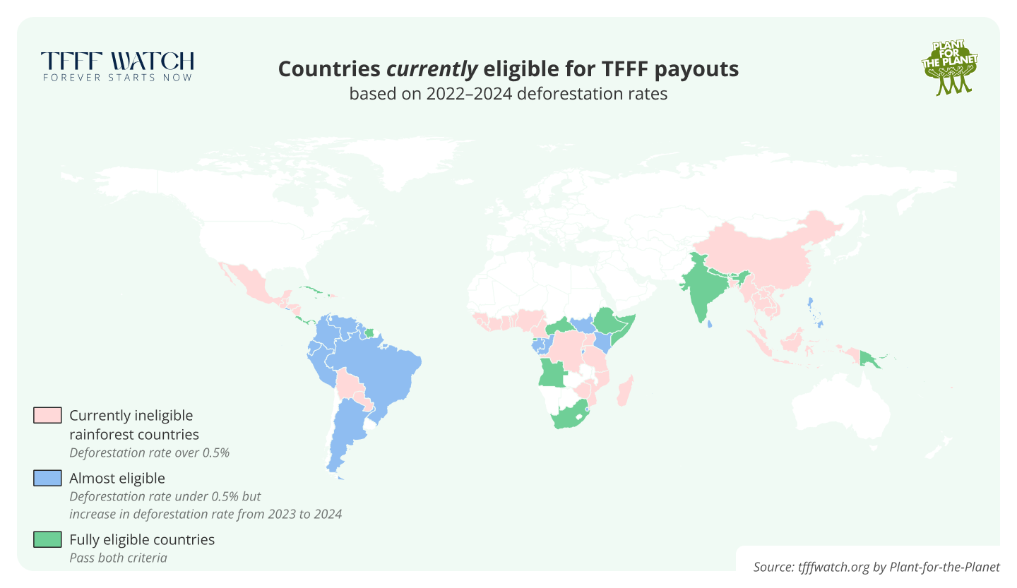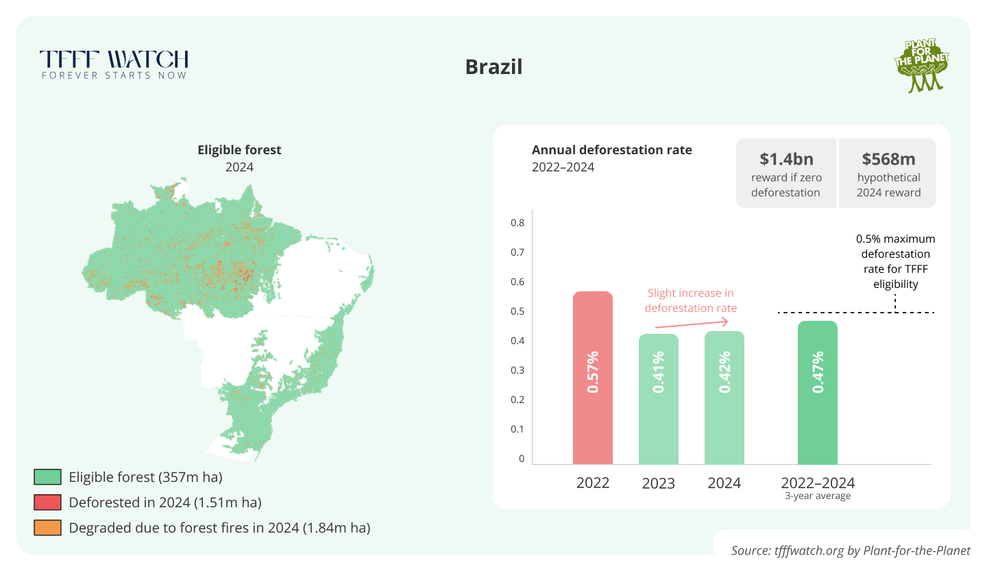 Considering the rapid decline of Brazilian deforestation rates since the beginning of Lula's administration in 2023 it is quite likely that deforestation will once again decline in 2025 and the country will be eligible once the TFFF becomes operational in 2026.