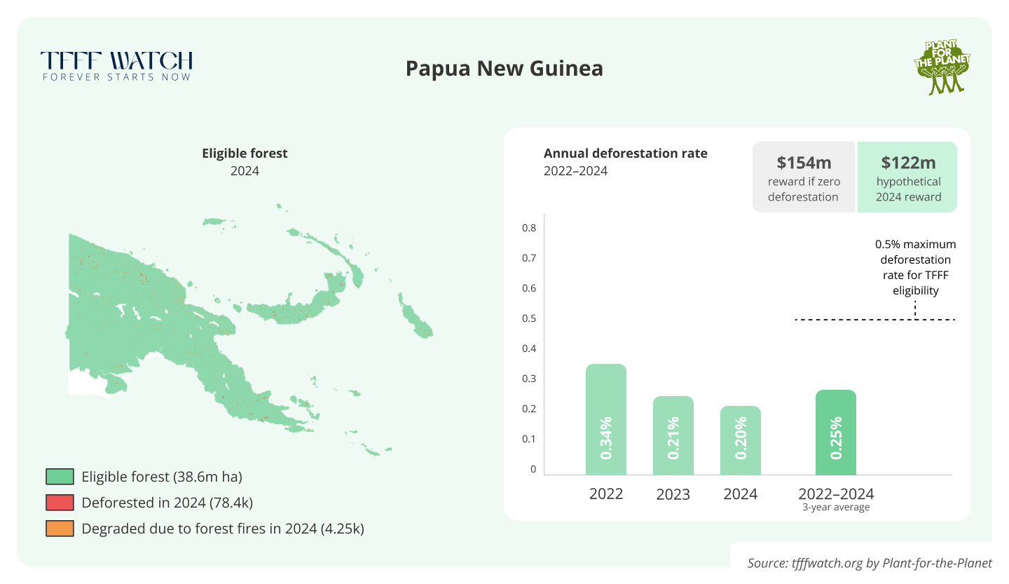 That would be rewarded generously. If TFFF were already operational, the country would receive $122 million this year based on its 2024 conservation efforts. If Papua ended deforestation entirely, their annual reward could increase to $154m.