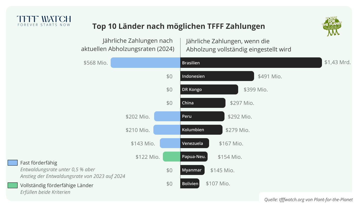 Wäre die TFFF bereits in Betrieb, wäre Papua-Neuguinea das einzige der zehn Länder mit den größten förderfähigen Regenwaldflächen, das sich aktuell vollständig für eine Auszahlung aus dem TFFF qualifiziert. Rund 122 Millionen US-Dollar würden dem Land dieses Jahr zustehen. Brasilien, Peru, Kolumbien und Venezuela liegen jedoch nahe an der Schwelle und könnten sich bis zum Start der TFFF vollständig qualifizieren. Wenn alle zehn Länder Abholzung und Wald-Degradierung komplett beenden würden, könnten sie gemeinsam die erhebliche Summe von 3,8 Milliarden US-Dollar jährlich an Prämien erhalten.